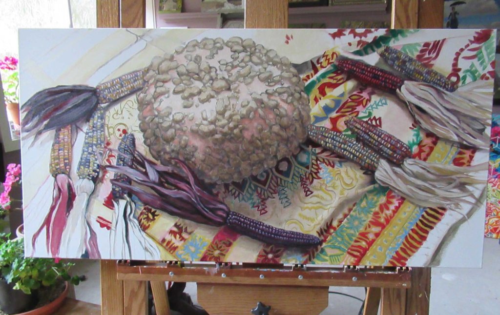 Had errands to run in town today, plus I helped a neighbor shovel out her chicken coop, so painting time was a bit limited. But I’m starting to make a little headway. This one’s so complicated I think it’s helpful for me to step away from it now and then, before I go nuts.