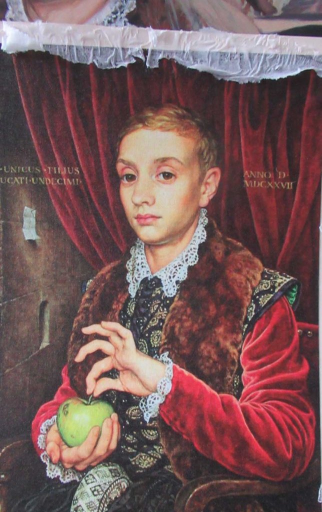 Painted with apologies to Michael Taylor, the British artist who painted “Boy With Apple” for the movie “The Grand Budapest Hotel”. In the movie, the painting was central to the plot as a priceless stolen masterpiece by the fictional painter Johannes Van Hoytl the Younger. — according to the AI description on Google (shown below).