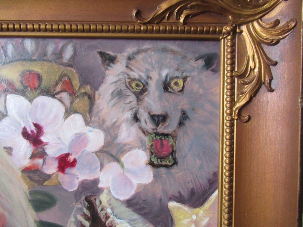The background is what my studio looks like. It’s winter now, and out the window a bizzard is raging. Wind howling, snow on the cedars and tamarack branches. In the upper right are some seashells from my vast collection, including a conch shell that I blew as I trudged along the Inca Trail to Machu Picchu back about 1994. Above that are some masks, including that of a snarling werewolf. I always stick it on the passenger head-rest in my car around Halloween.