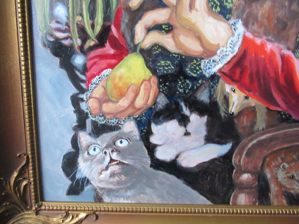 And of course I wanted to change the background, making it more like “my world”. That’s a spider plant I’m babysitting for a friend who winters in Florida. Orchids, from Home Depot, seem to love it here. In the lower left there are a two cats. The black & white one on my lap is my beloved Picasso, rescued as a baby kitty from the middle of the road 16 years ago. The gray one in front has one of those intense, mystified (horrified?) gazes every cat-owner out there has surely seen: the cat seems to be staring at something. Spooks? Here, the cat is gazing at small, glowing orbs…