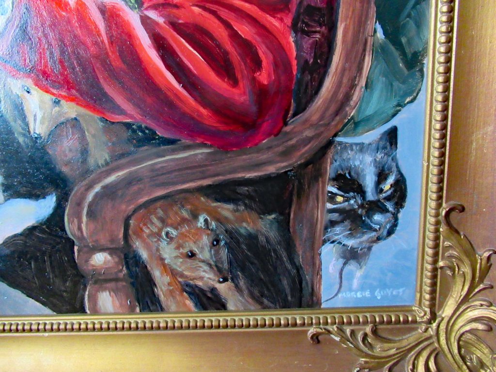 And finally, on the lower right is a proud cat, a freshly-killed mouse in its jaws. Plenty of mice here. I go through lots of mousetraps every year. The dead mice get tossed out the door, where grateful possums snatch them up during the night. And notice the mink “throw”. I happen to own one of those things, snagged years ago at Goodwill. It reminds me of all those Sunday mornings in church many years ago, staring at women who wore minks in the pew ahead.