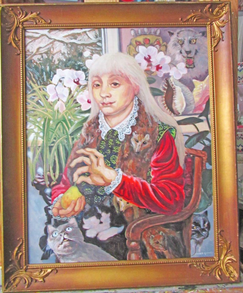 “The Grand Budapest Hotel” is one of my favorite movies and I get my kicks from bastarding famous paintings. I’m a jokester. At first I thought I’d turn it into a self-portrait. But as I got into it, I wanted to keep the same haughty expression as the boy showed. And those fingers! The only hint of self-portrait that remains is the long hair.