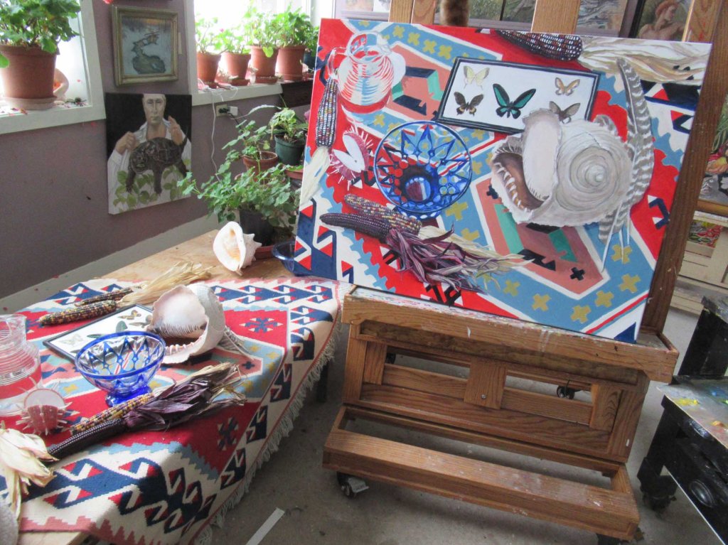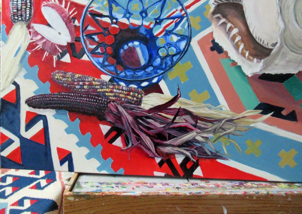 Could you imagine spending an entire day painting corn husks & kernels? That’s what my day was. And I’m not done with those yet! The Indian corn is from a year ago. Good thing I’d saved it. The farmers around here have mostly stopped growing it for some reason. I bagged it up and hung it up high — away from those rotten mice.