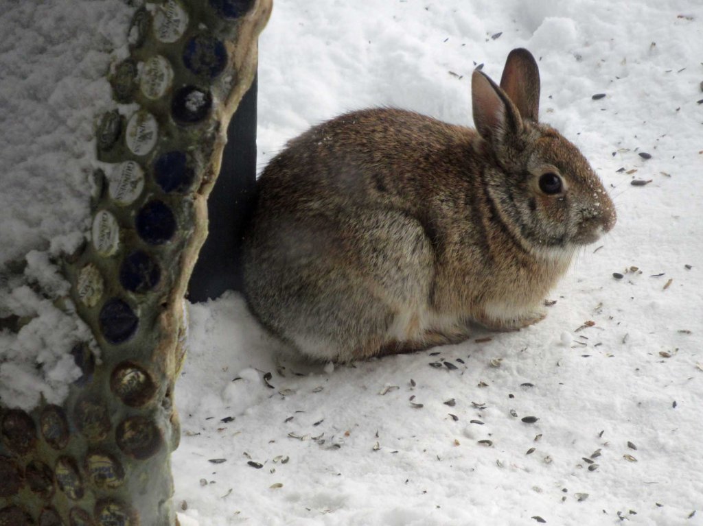 I finally was able to photograph the bunny that’s been coming to nibble on sunflower seeds. I laid out a carrot for him today. Rabbits have been scarce, thanks to the coyote population explosion.