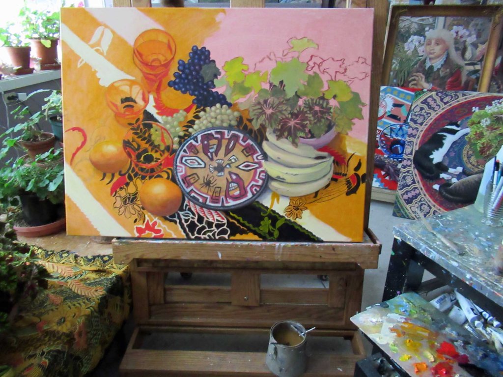 Rather challenging — all those patterns — but I know I’ll be able to “solve” them. Unlike the world’s problems. The good thing is that I could sit all day. Some days it seems like all ya wanna do is SIT… Worked on the oranges a little, darkening up the shadow side. We will see what the morrow brings….