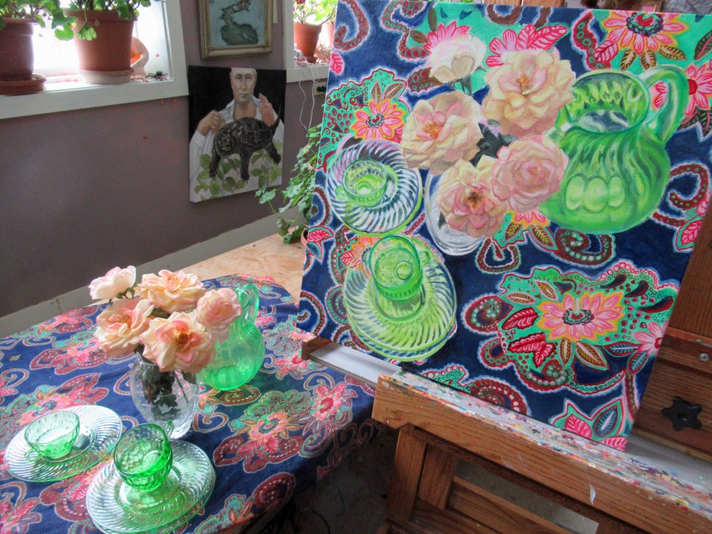 Beastly cold here today, Lots of little details to peck away on. Quite challenging, but I’d sooner figure out the complexities of an oil painting than figure out how to use the new iPhone I got. I’m clueless. Far easier to deal with shapes and colors! Today I was aiming at getting a very bright, dazzling green for the glass cups and plates. Tomorrow I’m going to try to snap up those roses….