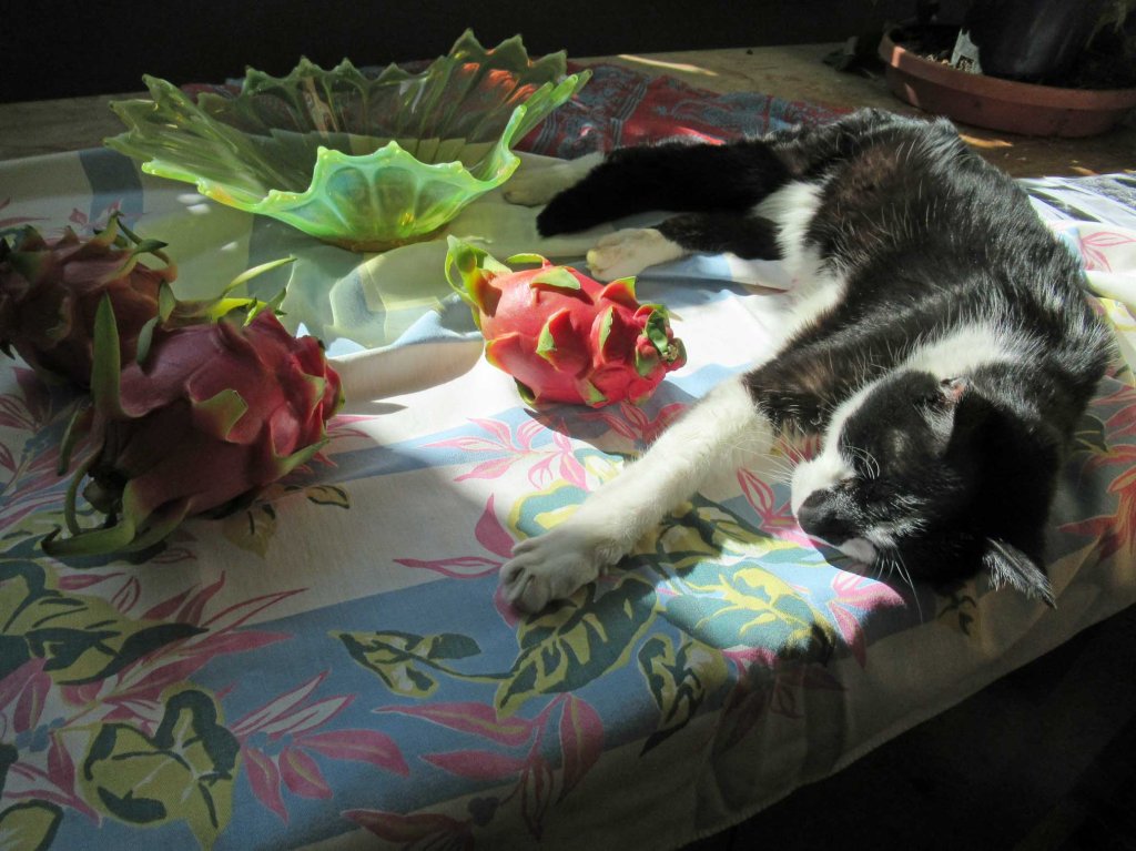 Yes, it was a challenge today. The cat decided he liked laying on top of my setup. And then there was the dazzling, bright sunlight. But I learned an important lesson: when trying to do an “actual size” painting, first measure the actual size of your setup. I’d grabbed a 24×48″ canvas and tried – in vain – to draw in actual sizes. Try as I might, I just couldn’t get things to fit! The dragon fruits were way too large. What was I doing wrong???