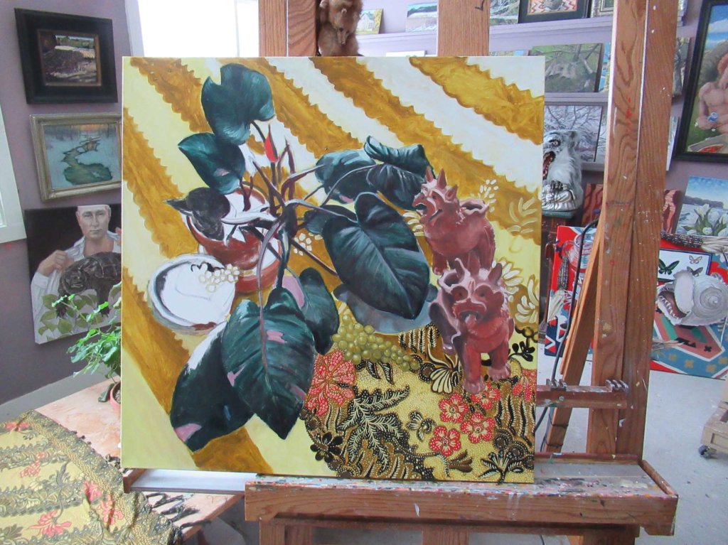 When wondering what to paint next, I decided to pick something that was challenging, something that would keep me occupied until the snow melts and gardening season begins. Hah. This one is it. I wasn’t happy with the “stripes” I’d blocked in of the fabric. They just didn’t look quite right. That’s one of the problems when it comes to drawing from life. Every time I’d step back to draw and then step back for a look, I’d be in a different vantage spot. Just enough of a difference to make the drawing a bit awry. Today I decided to try to correct the stripes (if possible). So maybe that will help. Some areas I had to give a thin coat of white. Once that’s dry I can give it a pale yellow.