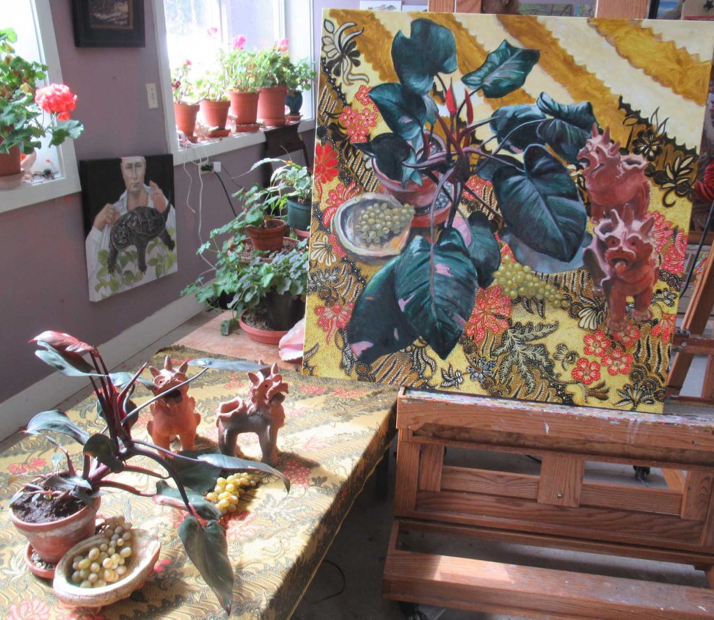 Egads. That fabric pattern is near to killing me. I added another leaf (upper right) just for the hell of it. This really makes me look forward to beautiful springtime. Green grass, flowers, warm breezes, etc. Nothing like spending a day out in the sunshine, painting en plein air!