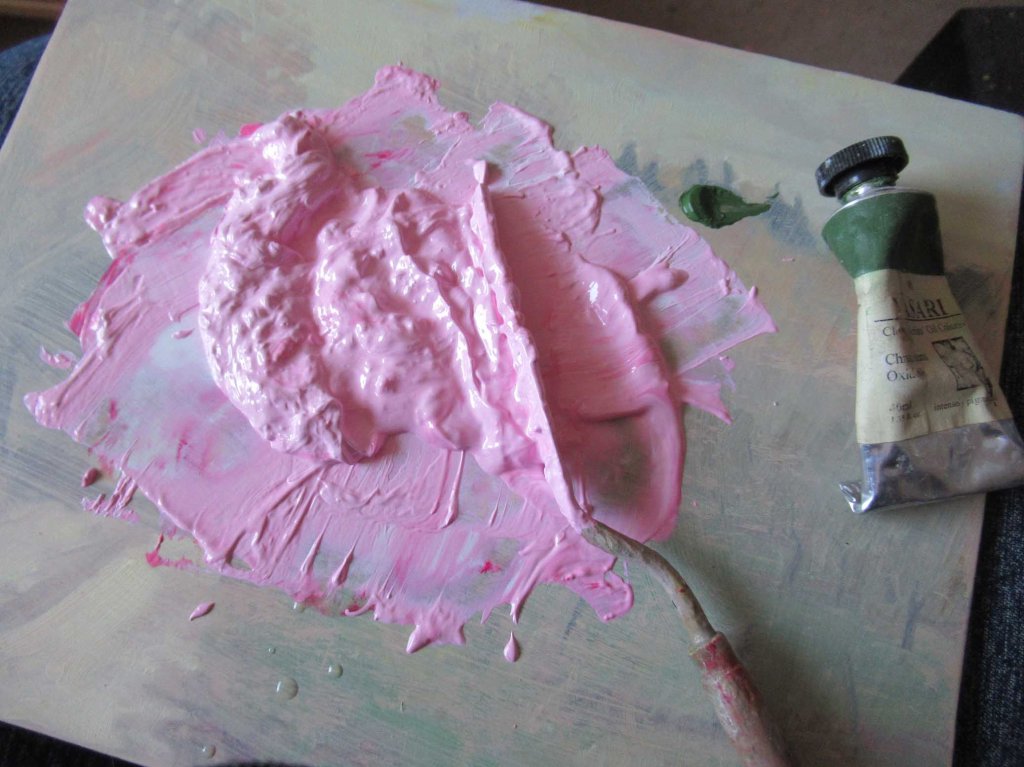 After setting the arrangement up, I wired a canvas and mixed up a basic light pink. Just a tiny speck of green helped to “gray it out” a little.