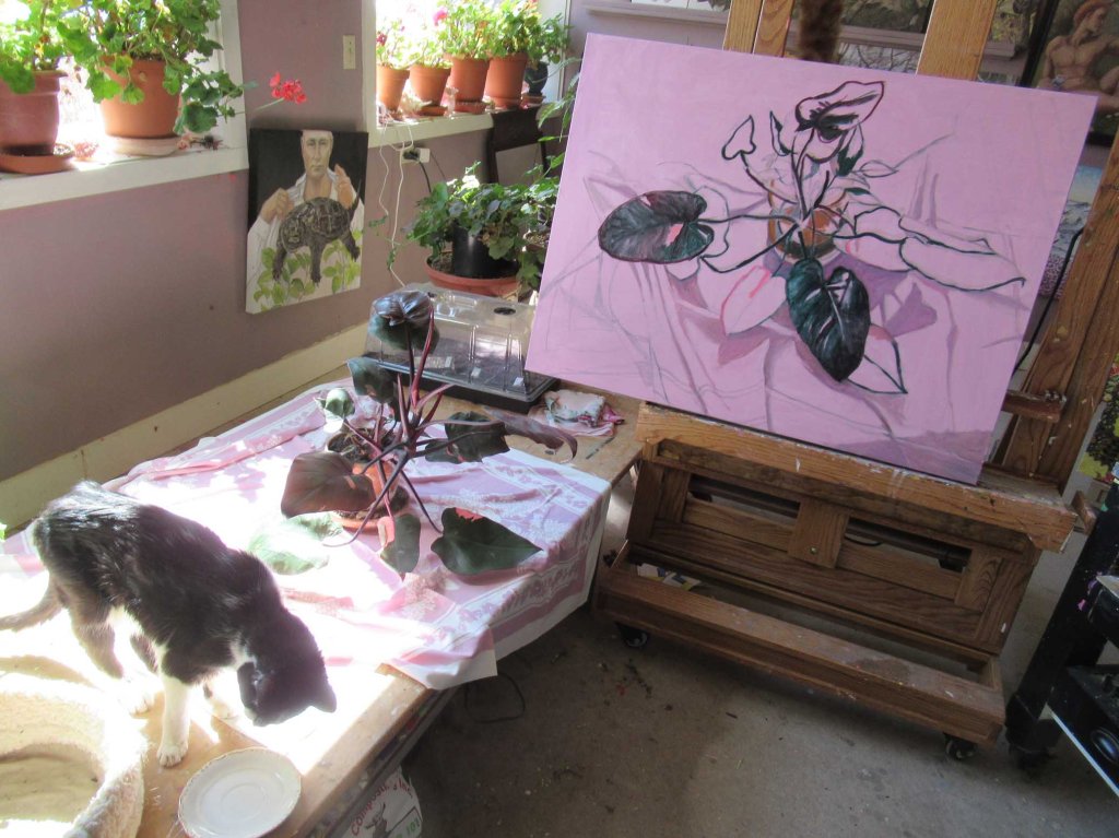 That plant, Pink Princess, is just too interesting to only paint once! Here she is again, with my dear Picasso. This time I used a simpler tablecloth, happily wrinkled.